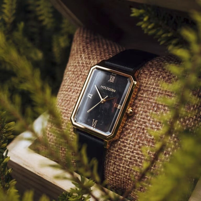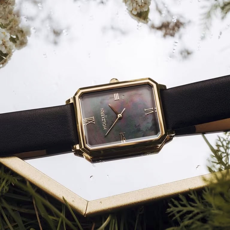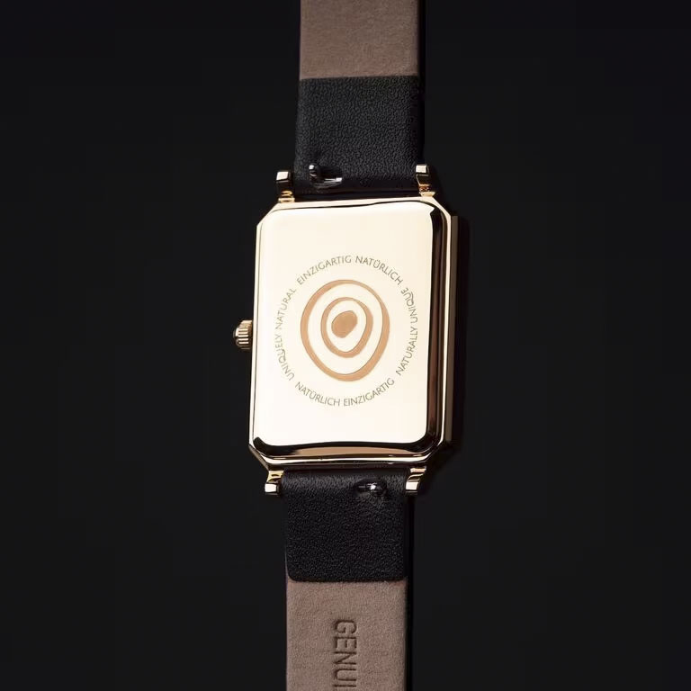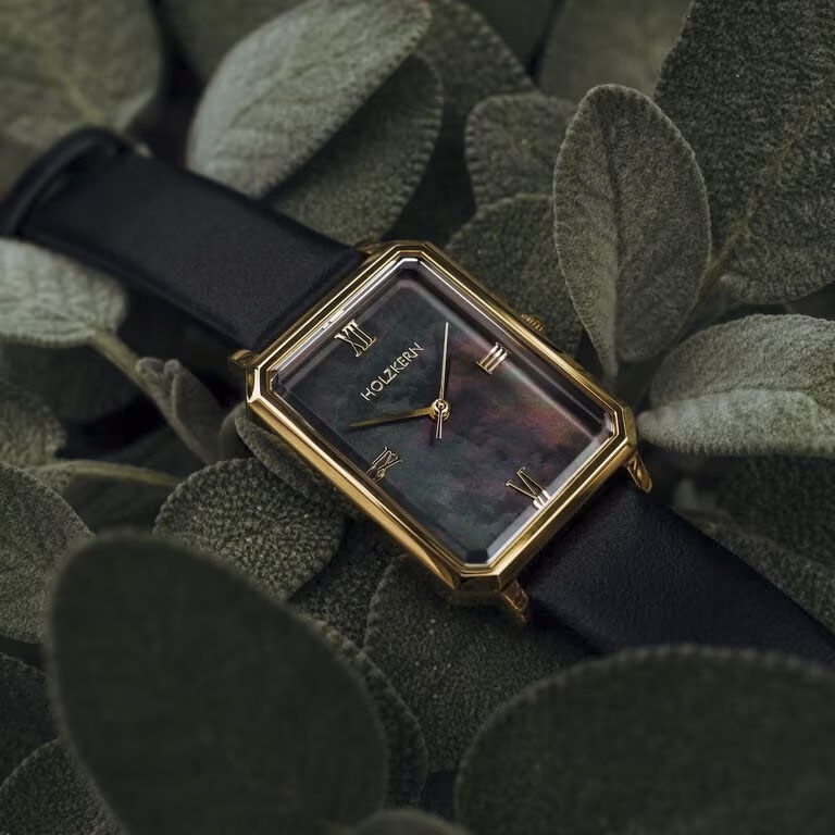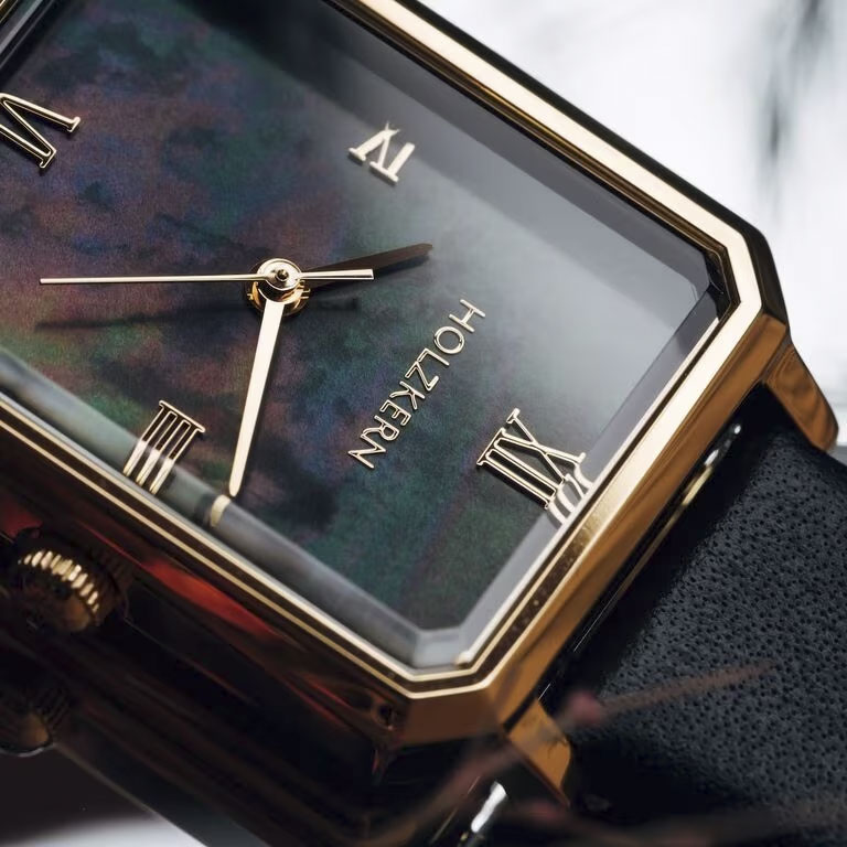 The Auctoritas model is a celebration of timeless elegance in a minimalistic form. Inspired by the Latin word for "influence" and "authority," it’s designed for women who lead with quiet confidence. The rectangular dial is made of genuine, black-colored mother-of-pearl that shimmers uniquely in every light— making each watch truly one of a kind. The combination of a matte gold stainless steel case and a soft black leather strap creates a luxurious contrast between warmth and depth.