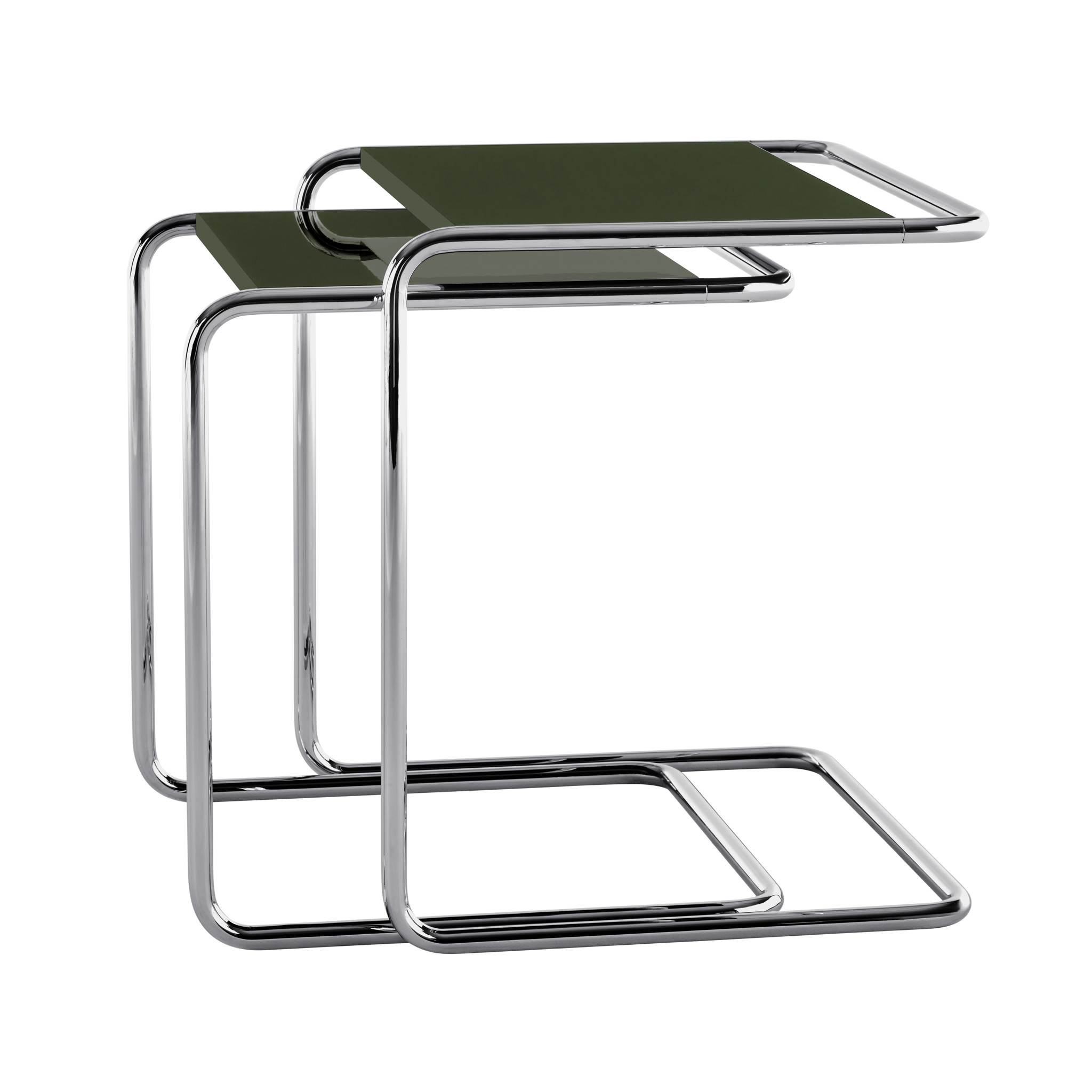 The tubular steel frame is finished in high-gloss “Titan” lacquer, giving the piece a reflective, almost metallic quality. Each set is available in one of five distinct finishes: