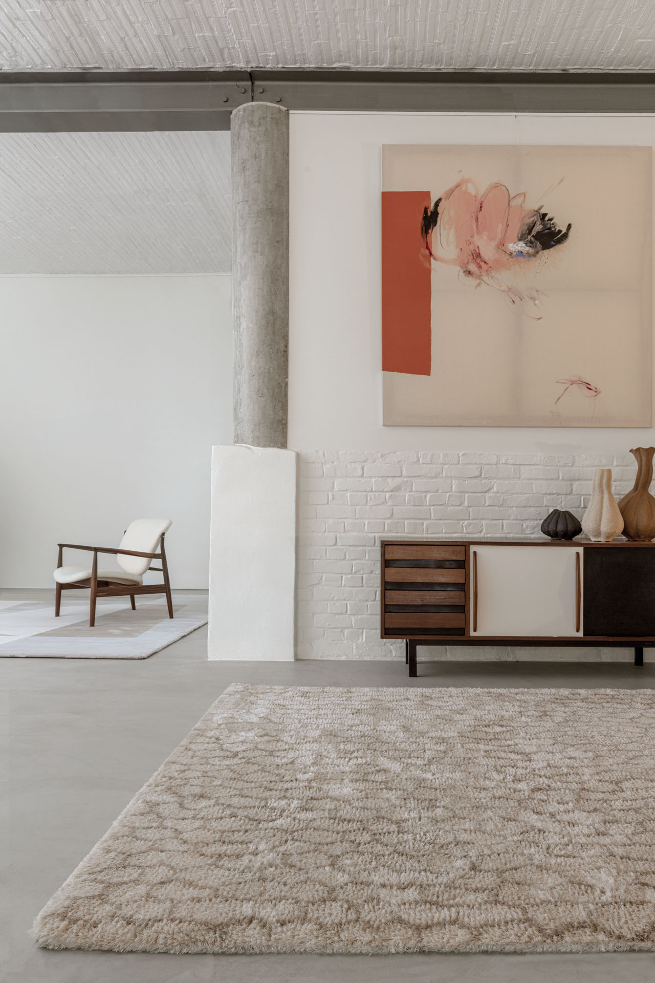 Measuring 170 × 230 cm, this rug fits beautifully into small living spaces, under lounge chairs, in bedrooms or as a focal point in entryways – always adding warmth and material clarity.