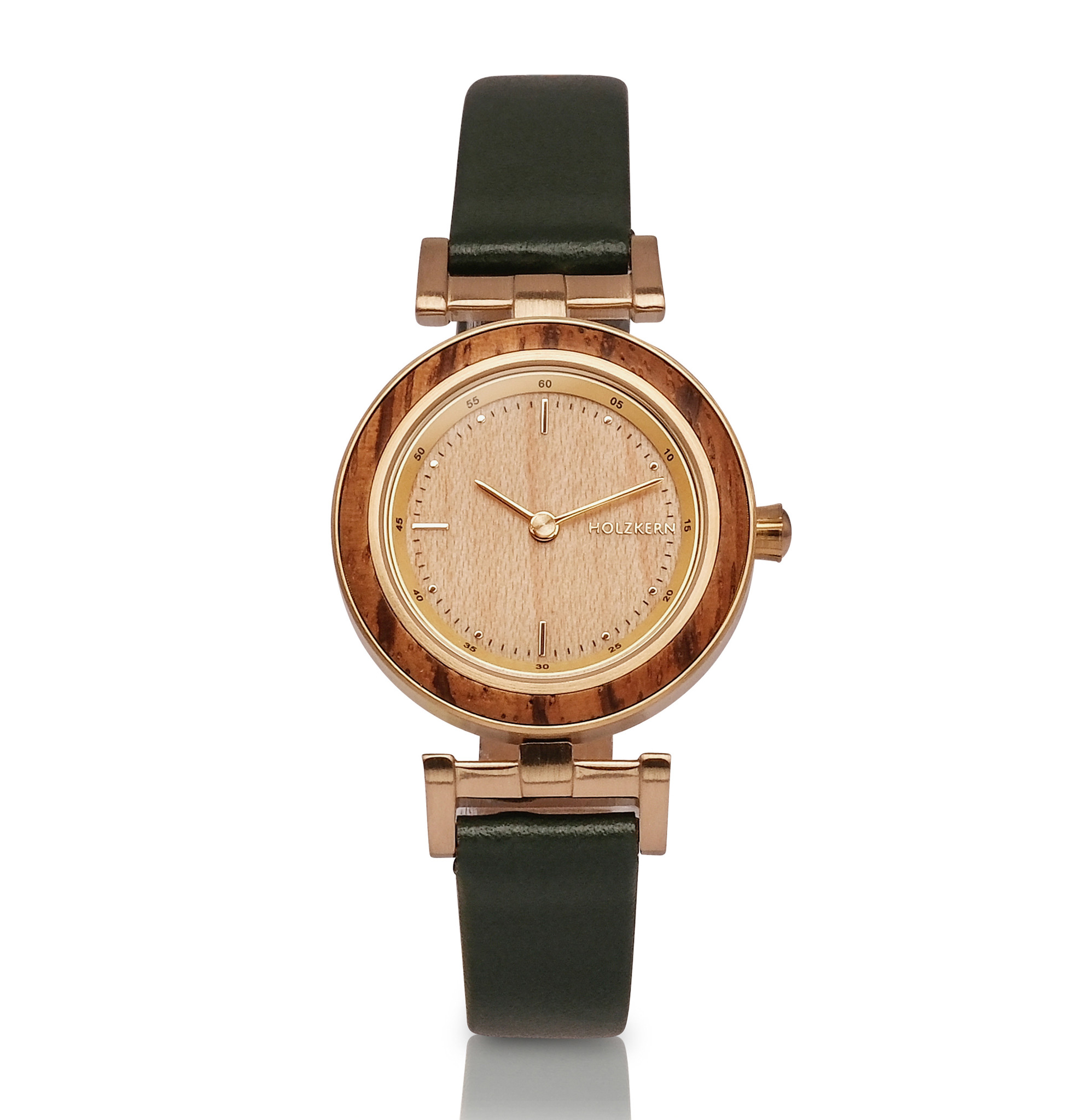 Laura – Zebrano & Oak: Elegant wood design with emerald leather strap. Lightweight, sustainable, and stylish for everyday or special moments.