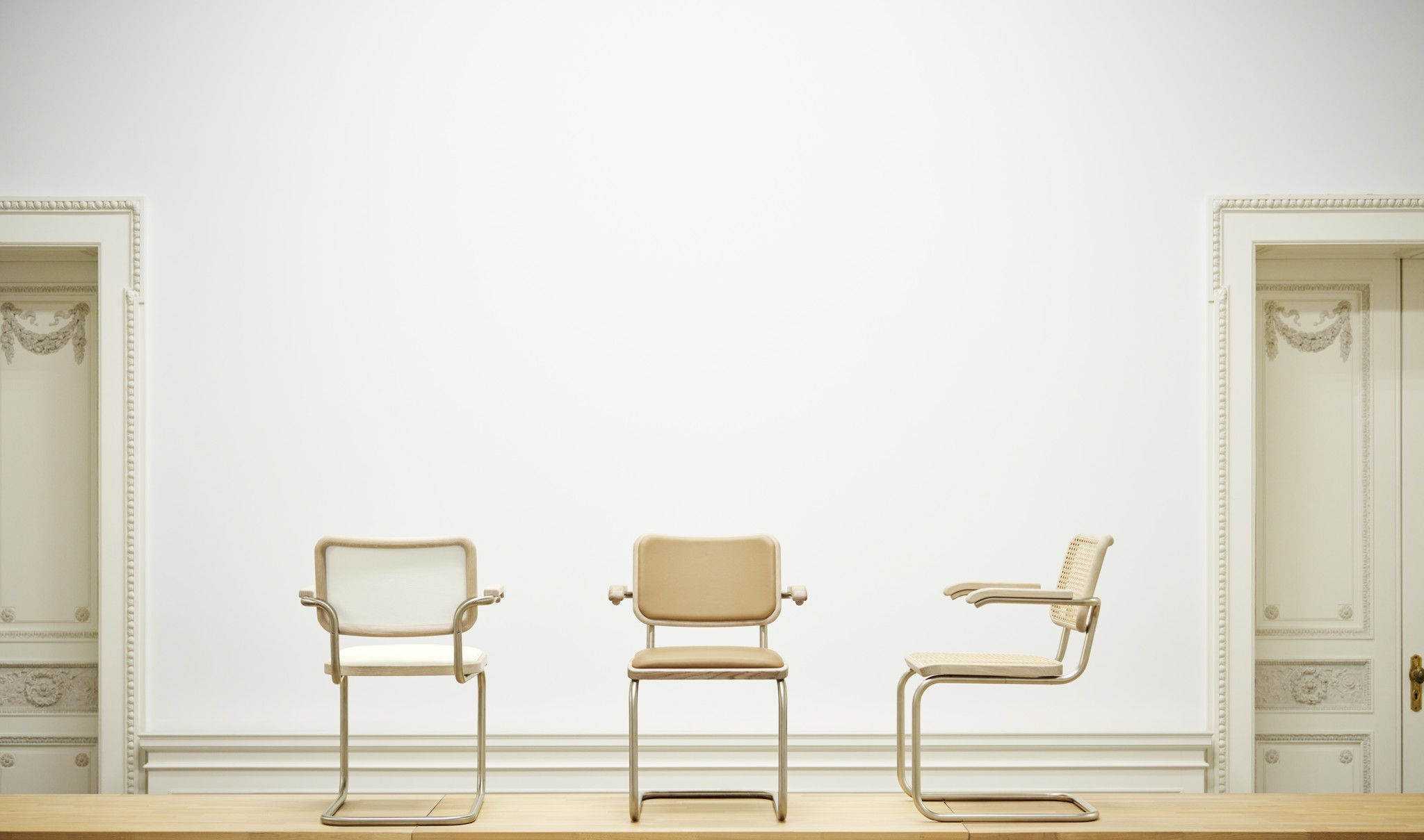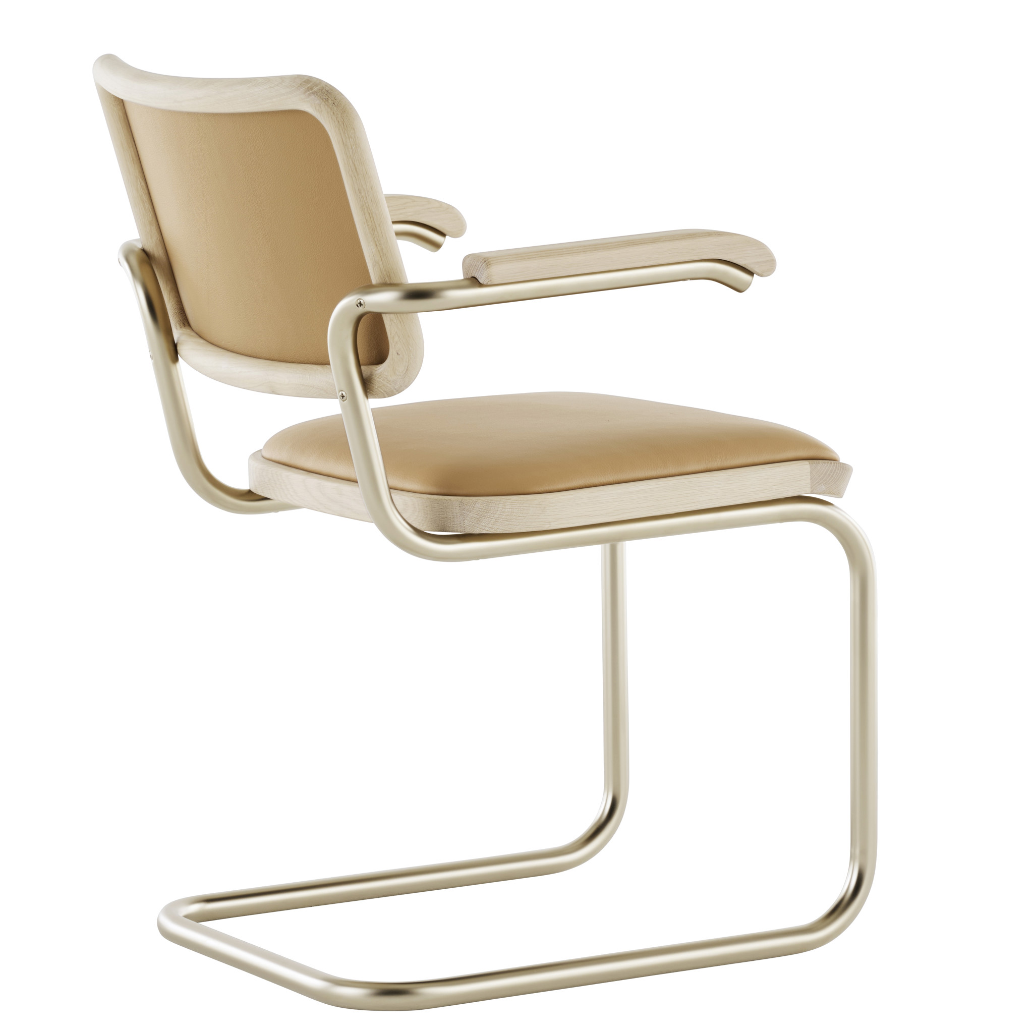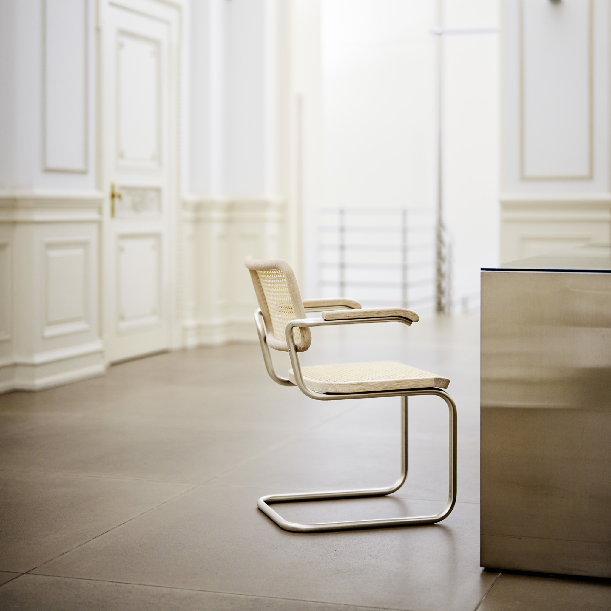 The S 64 Nordic Cantilever Chair is a refined reinterpretation of Marcel Breuer’s iconic Bauhaus design, created in collaboration with fashion designer Jil Sander. This special edition emphasizes clarity, warmth, and natural materials — combining a matte nickel-silver tubular steel frame with light oak armrests and a seat in either pale leather or natural cane webbing.