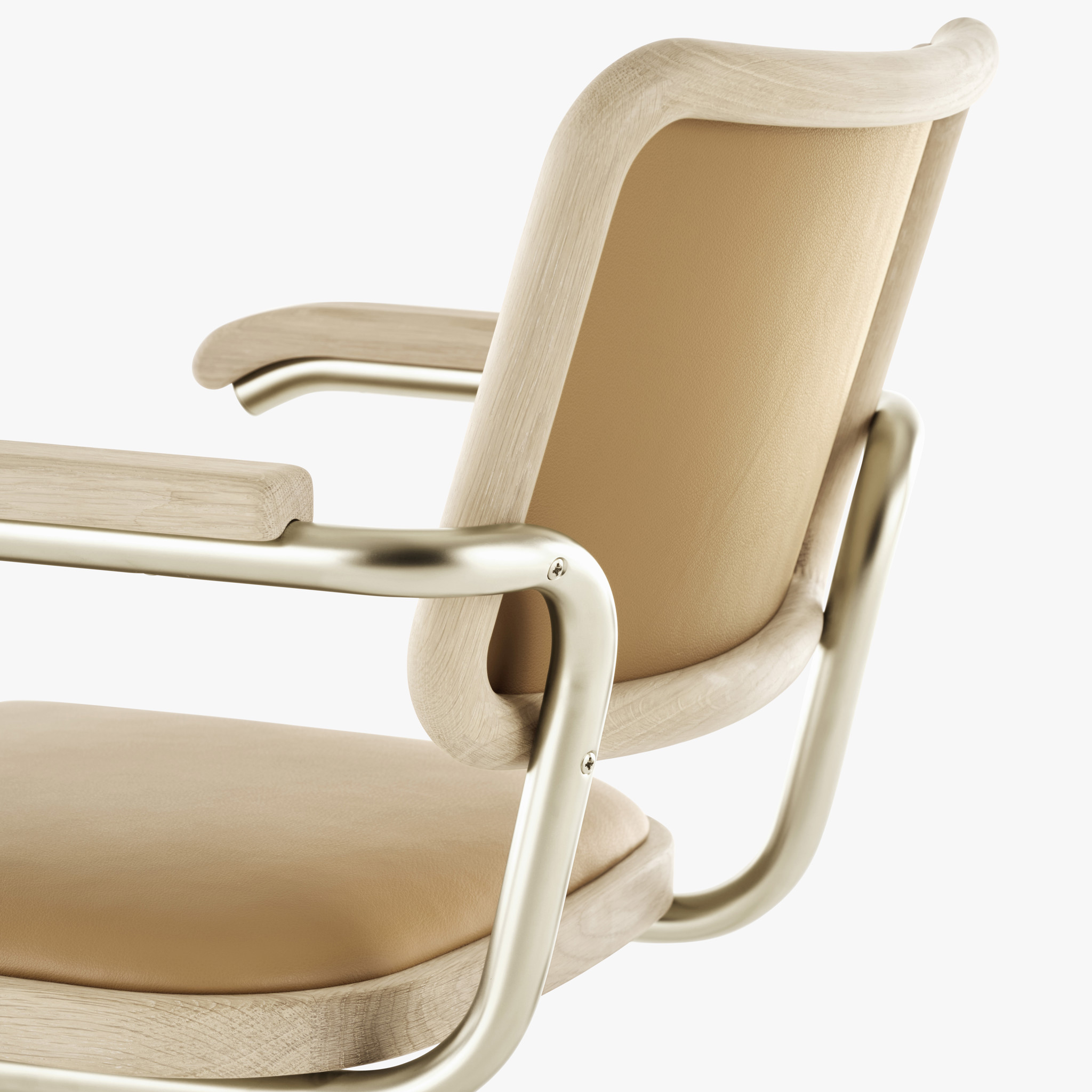 The matte finish of the nickel-silver frame offers a soft, understated glow, perfectly complementing the white-pigmented oak details. Choose between finely woven cane or vegetable-tanned leather in light natural tones. This unique combination reflects the Nordic spirit of calmness and light while preserving the timeless elegance of the original.