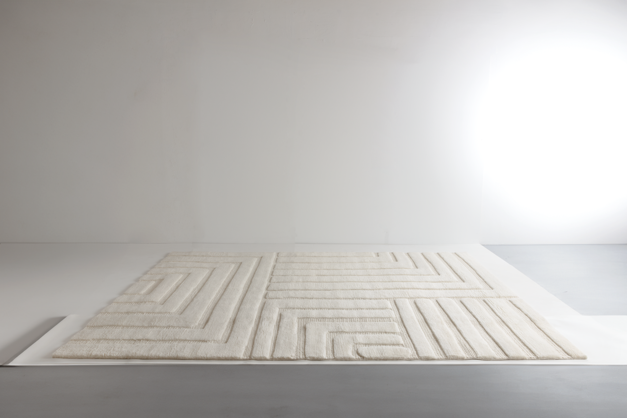 Handwoven in Belgium, the Samoa Maze Rug unites soft wool comfort with a bold geometric pattern – a refined statement for modern interiors.
