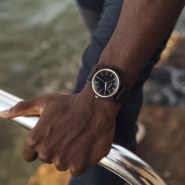 - & Marble Description The Summer Night model draws its inspiration from warm, serene evenings under a starlit sky—perfect for moments spent around a campfire or with close friends. The standout feature is the dial made from genuine black marble, creating an elegant and earthy texture that makes each piece truly unique. The case and strap are crafted from dark-stained maple wood, offering a lightweight and natural wearing experience. Together with the minimalist golden hands and markers, the design represents a refined balance between nature and timeless sophistication. Technical Details Case: Ø 40 mm; Material: Dark-stained maple wood