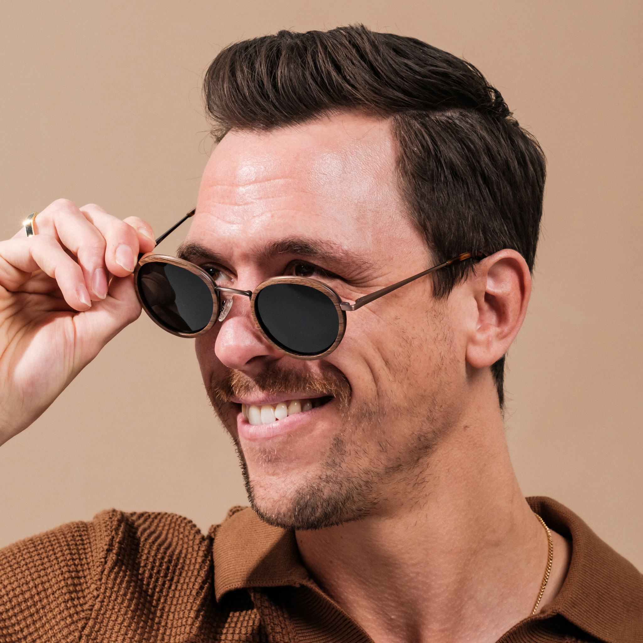 from genuine fine-grained walnut wood combined with stainless steel in a warm copper finish, these sunglasses let your confidence